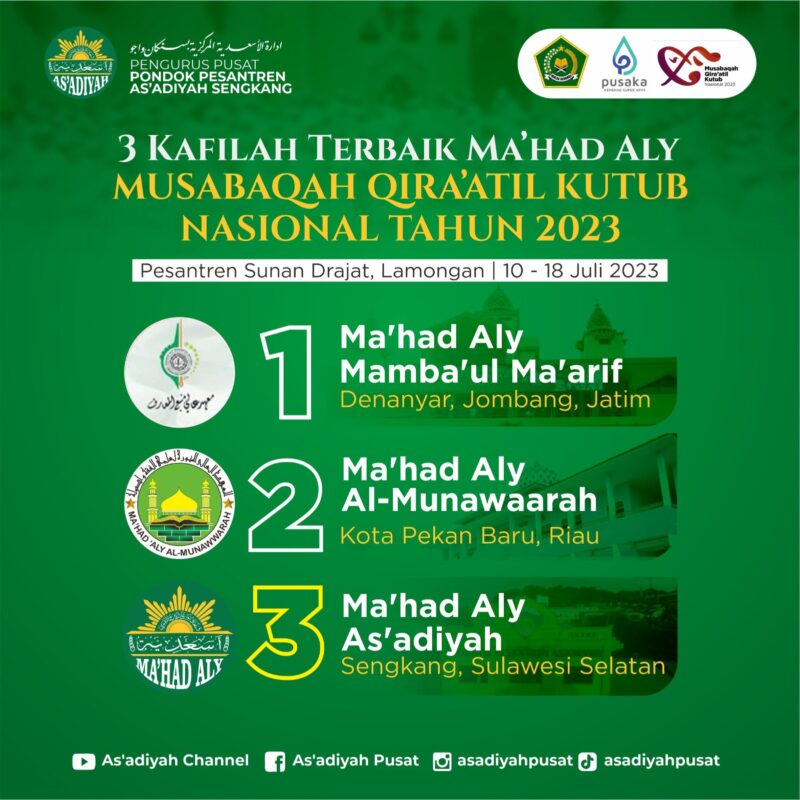 Malam harinya, juga dilakukan pengumuman peserta atau tim terbaik MQKN 2023, pada pengumuman tersebut satuan pendidikan Pondok Pesantren As’adiyah, Ma’had Aly As’adiyah berhasil meraih juara 1 Debat Qanun Ma’had Aly yang disampaikan secara langsung oleh Sekretaris Dewan Hakim KH. Ahmad Rusdi.