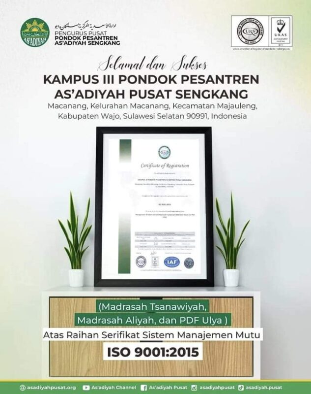 Media Center As’adiyah – Pondok Pesantren As’adiyah Meraih sebuah pencapaian yang sangat membanggakan yaitu, Kampus II Pondok Pesantren As’adiyah yang berlokasi di Jl. Veteran No. 46 Sengkang serta Kampus III Pondok Pesantren As’adiyah yang terletak di Macanang secara resmi telah memperoleh sertifikat sistem manajemen mutu ISO 9001:2015.