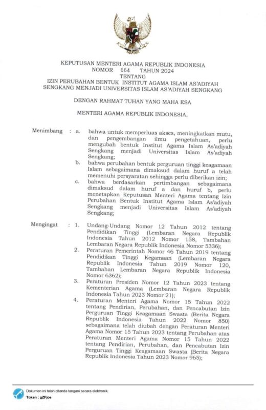 Media Center As’adiyah – Institut Agama Islam As’adiyah Sengkang secara resmi telah berubah bentuk menjadi Universitas Islam As’adiyah Sengkang. Perubahan ini ditetapkan oleh Pemerintah Indonesia melalui Surat Keputusan Menteri Agama RI nomor 664 tahun 2024.