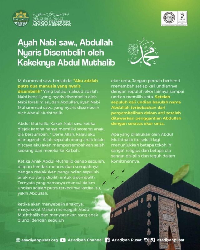 Dalam konteks ini ada riwayat yang diperselisihkan ulama kesahihannya menyatakan bahwa Nabi Muhammad saw. bersabda: “Aku adalah putra dua manusia yang nyaris disembelih.” Yang beliau maksud adalah Nabi Isma’il yang nyaris disembelih oleh Nabi Ibrahim as., dan Abdullah, ayah Nabi Muhammad saw., yang nyaris disembelih oleh Abdul Muththalib.