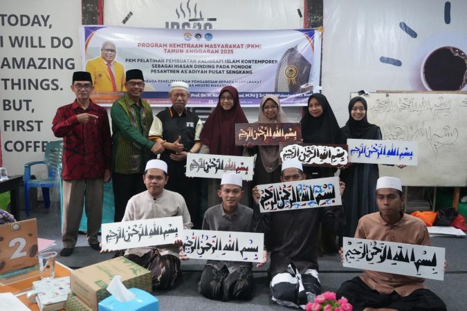 Media Center As’adiyah — Pondok Pesantren Pusat As’adiyah Sengkang menjadi lokasi pelaksanaan Pelatihan Kaligrafi Islam Kontemporer sebagai Hiasan Dinding yang digelar tim pengabdian Fakultas Seni dan Desain Universitas Negeri Makassar (FSD UNM). Kegiatan ini bertujuan mengembangkan potensi wirausaha kreatif santri melalui perpaduan seni dan nilai dakwah yang dikemas dalam bentuk pelatihan kaligrafi modern.
